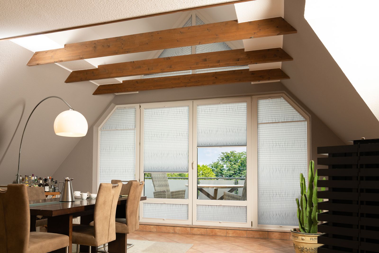 Unsere Plissees vereinen Funktionalität mit modernem Design. Ob Abdunkelung für das Schlafzimmer oder lichtdurchlässiger Sichtschutz für das Wohnzimmer – wählen Sie aus hunderten Farben und Stoffen. Dank Millimeterarbeit passen sie auch in Sonderformen wie Dachfenster.